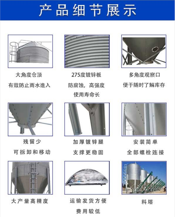 散裝料塔主要用于存儲(chǔ)干粉或顆粒狀復(fù)合飼料。其實(shí)料塔的生產(chǎn)材料有很多,如:鍍鋅材料料塔、碳鋼儲(chǔ)藏塔、玻璃鋼料塔等等。此外,不同材料的料塔其體積也會(huì)不同,根據(jù)體積和形狀我們可分為多種型號(hào),底部帶有圓錐形的散裝料塔可用于農(nóng)場(chǎng)、谷物儲(chǔ)存以及用于進(jìn)料和研磨的工具。當(dāng)然,它也可以用于短期或臨時(shí)谷物的存儲(chǔ)。